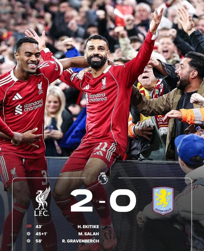 2025年11月02日 终结英超4连败!利物浦2-0维拉暂升第3 萨拉赫连场破门大马丁送礼