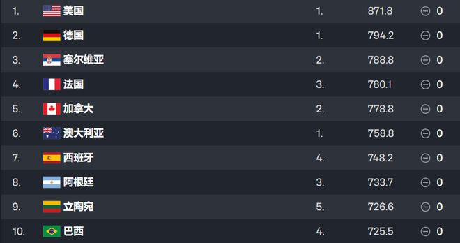 本次的前十名完全没有变化,依然是美洲和欧洲国家两分天下。美国队还是当之无愧的世界第一,尽管世预赛他们派出的仅仅是一群完全叫不出名字的球员,但他们还是能够在比赛中嘎嘎乱杀。